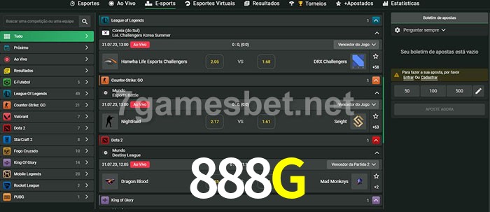 A 888G oferece uma seleção abrangente de opções de apostas em e-sports. Com uma ampla variedade de jogos para escolher, incluindo League of Legends, Dota 2 e CS:GO, há algo para todos os fãs de esportes eletrônicos. Além das apostas pré-jogo, a 888G também oferece opções de apostas ao vivo para muitos de seus eventos de e-sports. Portanto, seja você um novato em apostas em e-sports ou um profissional experiente, a 888G bet tem tudo o que você precisa para começar.